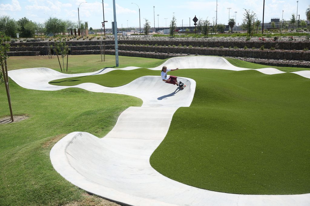 The Deck, Eastmark’s skate park, caters to varying styles and skill levels of skateboarding, with numerous shade structures, seating areas, and open green spaces.