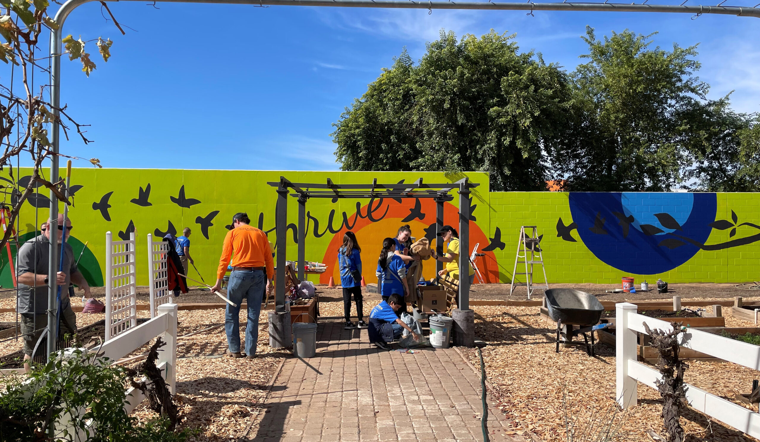 Mark’s design was the perfect starting point for the mural concept. I was given a 93’ x 11’ blank canvas on which to create a design to complement the landscape design elements. The painting also had to be comfortably completed within three to four hours by volunteers on Community Action Day. That’s no small task! The mural includes a zesty, lime twist background with multi-colored spheres. Outstretched branches on either side envelope the flocks of birds and the word “Thrive.” The lines within the painting replicate the flowing, river-like pattern in the landscape architecture elements that Mark created, all of which are enhanced and cohered by RVi Landscape Architect, Sergio Yamada’s bold, playful wooden flowers scattered throughout the area.