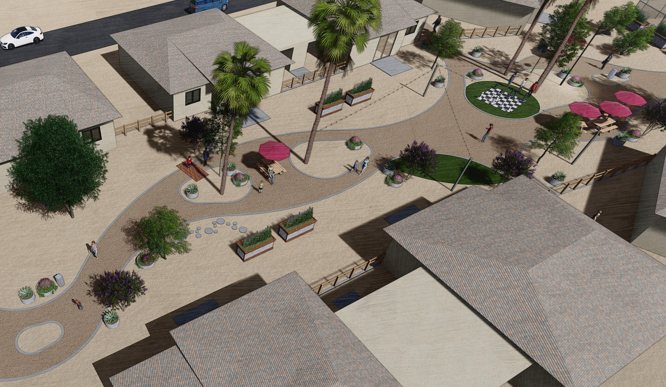 The RVi design team visited the site and met with The House of Refuge staff to better understand how to provide an area that would suit their needs. Recognizing the transitional nature of the community, the team was inspired by the idea of the journey on the “river of life.” The team realized that everyone experiences rough waters, crossroads in the journey, and twists and turns along the way. A path was created to represent “The River” that leads through the entire site and terminates at the large open space which serves as the community gathering area next to the garden. Along the path, raised circular planters were installed to provide interest and color throughout. Additional trees were installed to provide shade in the future. The design included ample room for community events, picnic tables, canopies, an oversized board game area and artificial turf.