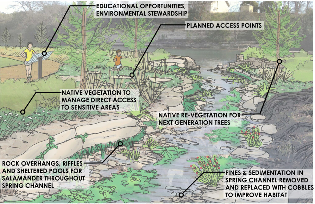When planning to alter the landscape, one key factor that must be kept in mind is the potential impact that will be felt by the current natural habitat. If done poorly, the landscape can create an opening for invasive species to engulf the native organisms, starving them of their natural resources. However, when done right, new projects can be an opportunity to strengthen the natural ecosystem and aid native organisms. During the planning and design of San Gabriel Park in Georgetown, Texas, RVi worked diligently with Cambrian Environmental to restore three natural spring habitats, as well as re-create a natural habitat for potentially endangered species along the San Gabriel River.