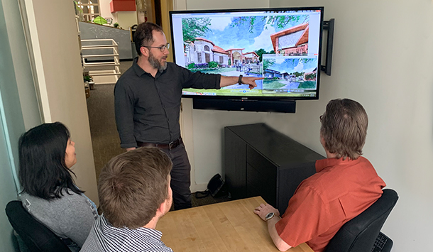 RVi Designer Robin Winter has led the firm’s 3D visualization studio, beginning with the incorporation of Lumion software to create finished graphics. Robin is now demonstrating how we can use Lumion to involve clients in the creation of the design. “When we meet with a client or user group, we can make updates to the 3D model in real time. We can adjust almost anything about the design – from the height of an entry monument to the materials used to build it, to the plant selections that surround it,” Robin said. “Multiple iterations used to take days – sometimes weeks. With this technology we can do multiple iterations in a matter of minutes, and the best part is that the client is right there, participating in the conversation.”