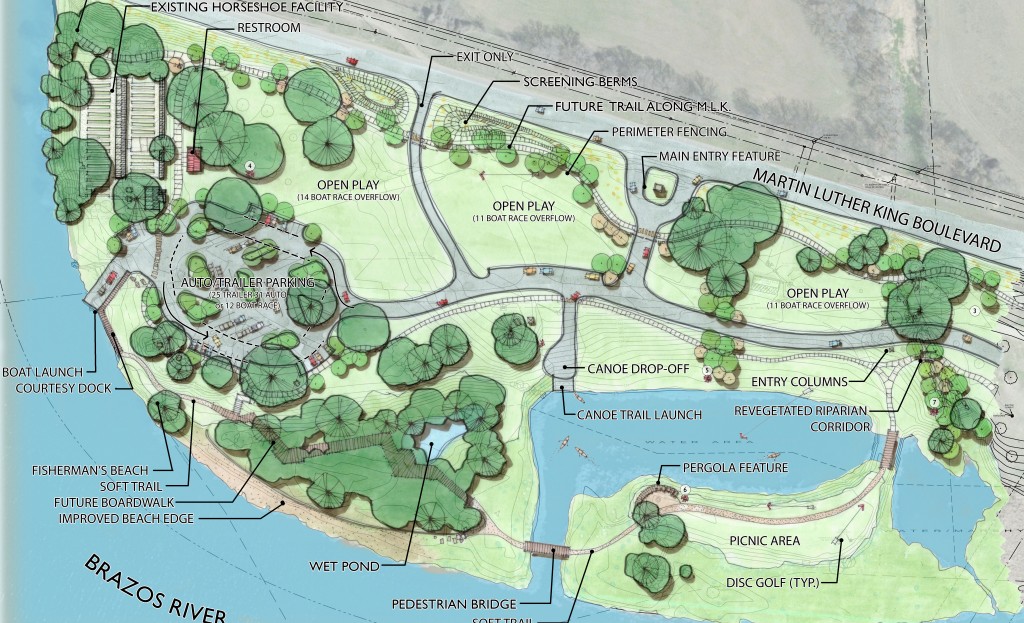 For almost a century, the City of Waco has been developing a unique park system along the shores of the Brazos River. One key part of this system is the 35–acre Brazos Park East. This park has become the Waco park system’s epicenter for large events, boat races and horseshoe tournaments. As the uses of the park have expanded, the need for redesign and redefinition of the park has become more and more apparent. RVi was called in to analyze the community’s use of the park and to provide landscape architecture and park design services in order to give the park more structure and weight in the overall Waco park system. The redesign included facilitating stakeholder input, improving the bulkhead, seating and concert venue, creating entry drives, parking, circulation, boat ramps, an overlook of the Brazos River, and pedestrian circulation with connection to the overall Waco trail system.