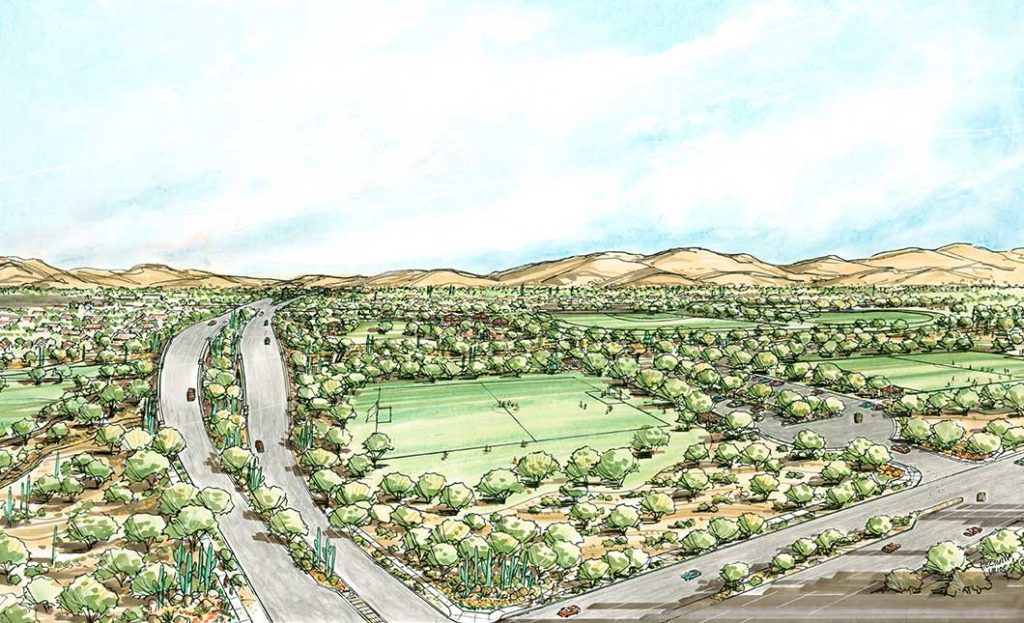 The team’s role in the project included General Plan Amendment processing, master planning and rezoning services, site planning, lotting design, landscape, and entry monument design.