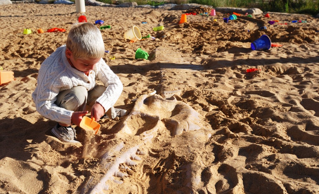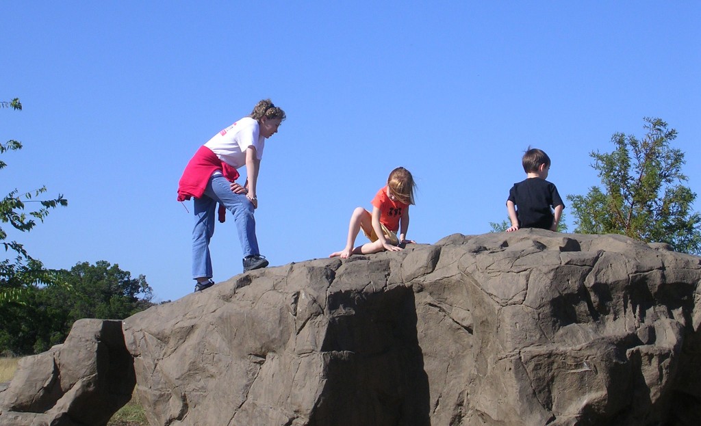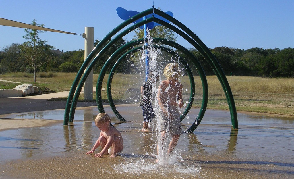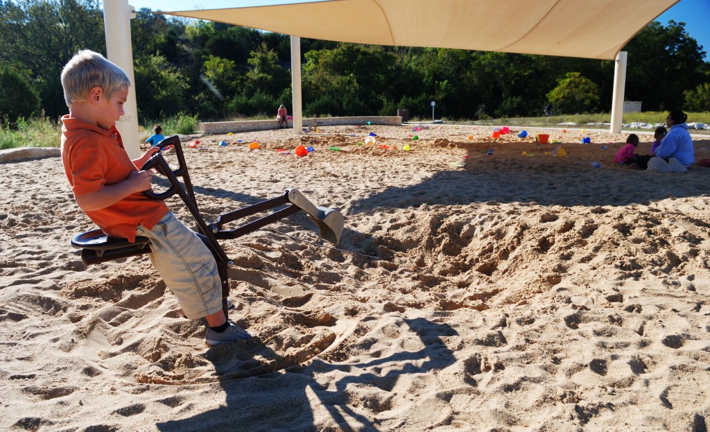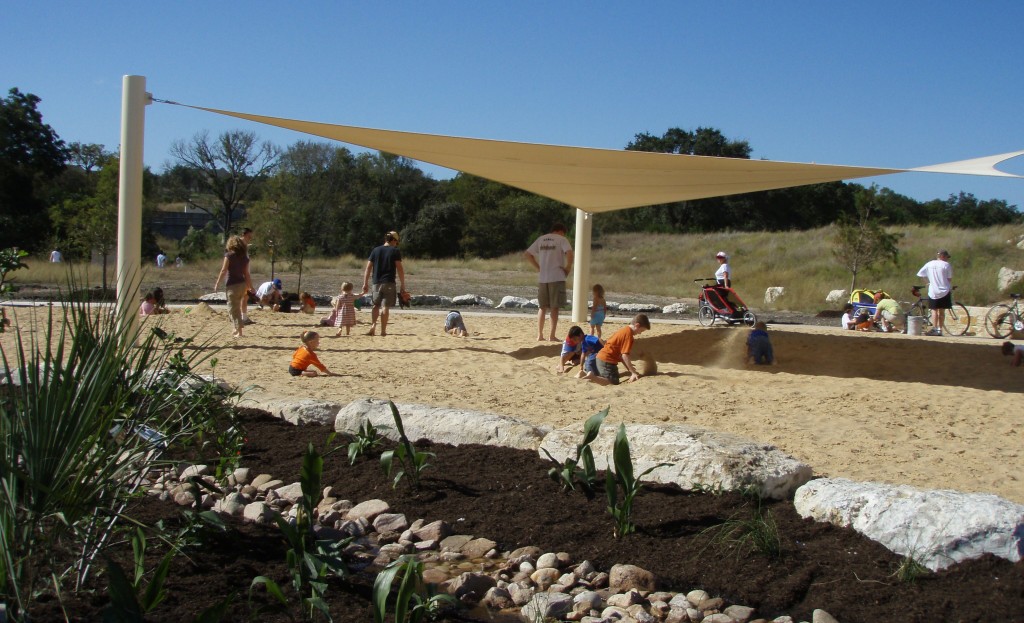 Champion Park brings the remnants of a prehistoric inland sea to the surface in a modern day park for children of all ages. The park’s theme is drawn from the site’s 65 million year history, aiming to inspire children’s fascination with dinosaurs and sea creatures. The “dino pit” is a massive sandbox where children can dig for fossils, which were cast in concrete with assistance from The University of Texas’ Paleontology Department. The splash pad features a tail and skeleton of a whale, with a blow hole that erupts sporadically. The drainage from the splash pad creates a bioswale that runs between play features and is filled with plants to simulate a lush prehistoric forest.