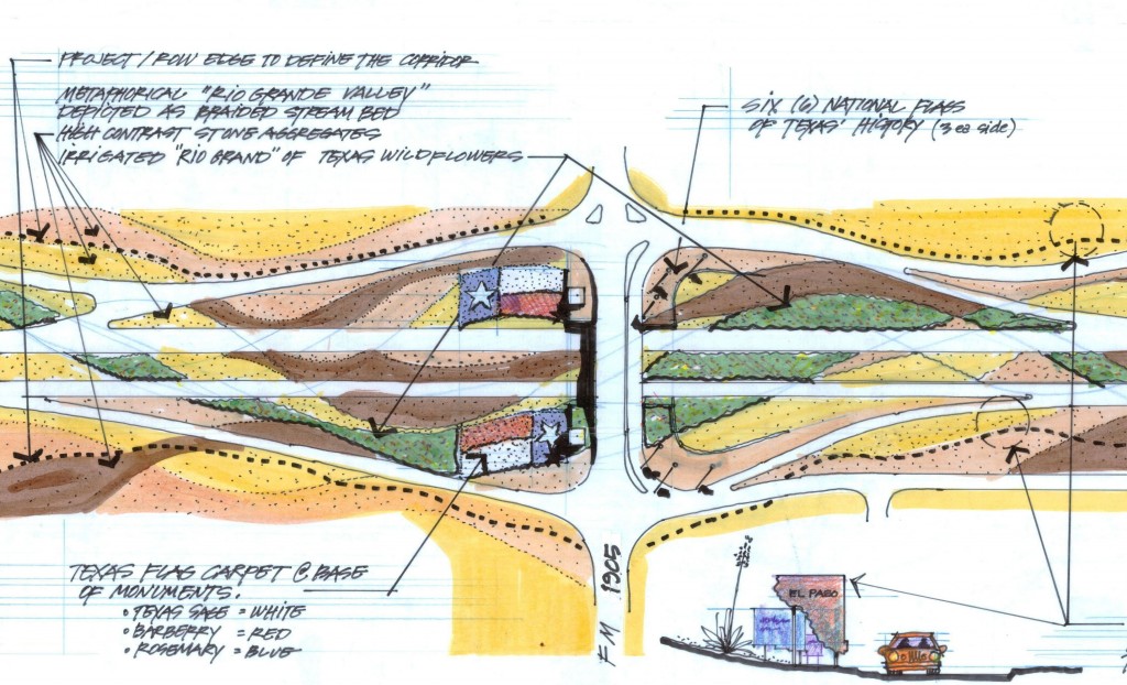 As part of a regional transportation enhancement project, RVi was consulted to provide highway aesthetics design guidelines for ten miles of I-10 in El Paso, Texas. The corridor, beginning at the New Mexico border, included three major intersections that collectively serve as the “gateway” to Texas. The project approach included extensive site inventory/analysis and research of local and regional geography, history, culture, and El Paso’s extensive existing highway aesthetics system.