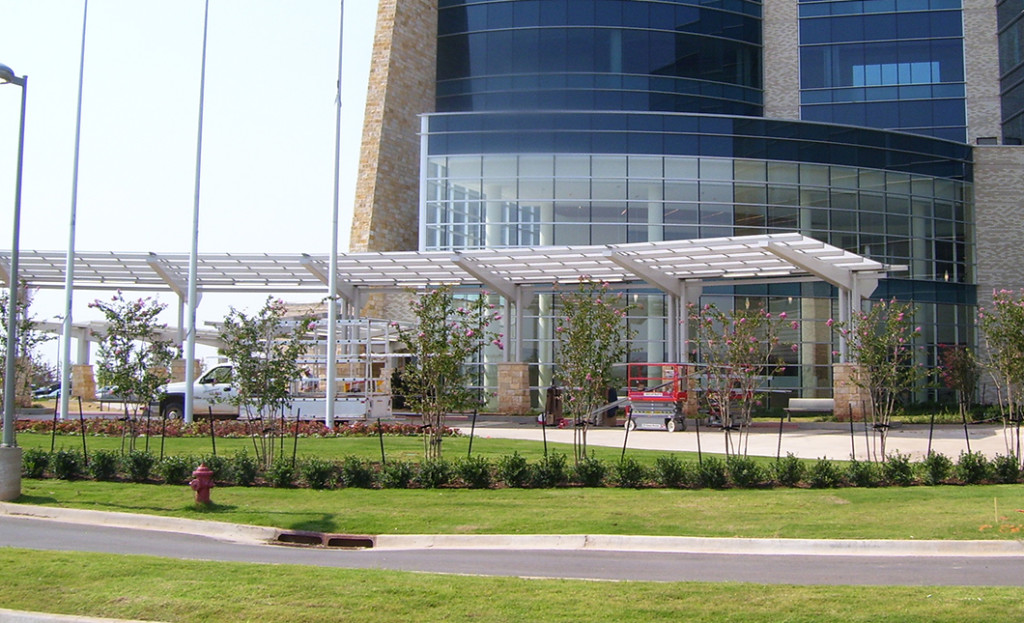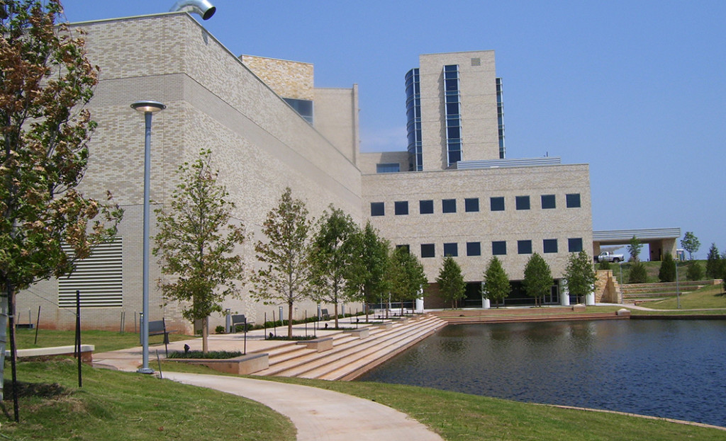 This major medical center is located on 34 acres of raw land west of Norman, Oklahoma. An existing large pond is located within the treeless and natural prairie site. Framing the north side of the hospital is a major tree-lined boulevard that provides convenient access to shaded parking areas and three prominent entryways. The parking design focuses on convenient direct pedestrian access to the hospital, crossing Medical Park Drive at key locations. Hospital entrances are articulated with special arced pedestrian paving patterns, seating for hospital patrons and custom-designed bollards that separate automobiles from pedestrians.