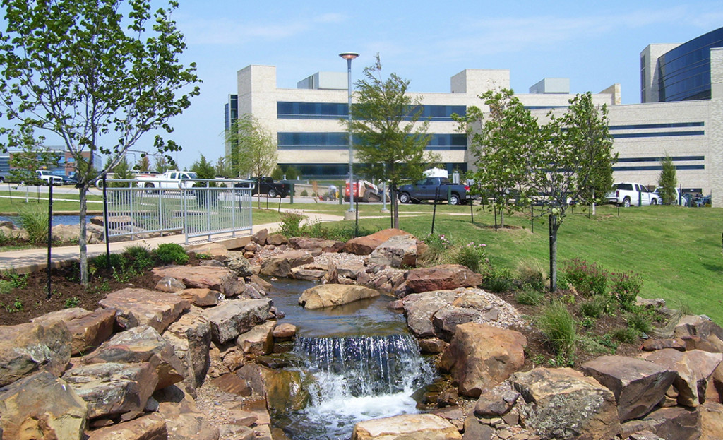 This major medical center is located on 34 acres of raw land west of Norman, Oklahoma. An existing large pond is located within the treeless and natural prairie site. Framing the north side of the hospital is a major tree-lined boulevard that provides convenient access to shaded parking areas and three prominent entryways. The parking design focuses on convenient direct pedestrian access to the hospital, crossing Medical Park Drive at key locations. Hospital entrances are articulated with special arced pedestrian paving patterns, seating for hospital patrons and custom-designed bollards that separate automobiles from pedestrians.