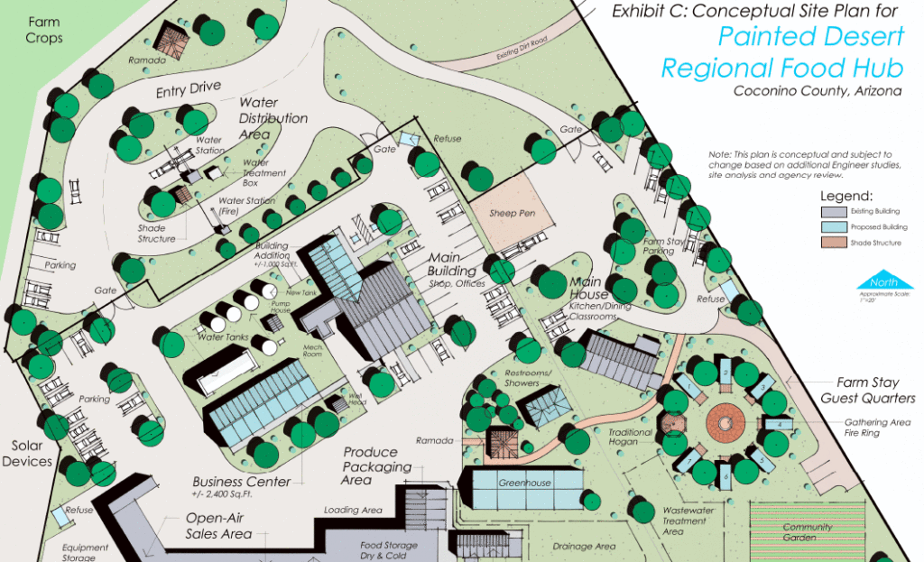 Capitalizing on the idea of agritourism, by providing a bridge between farmers and consumers, the Painted Desert Regional Food Hub will provide the community and visitors the chance to experience life in the country, learn where their food comes from, and how it is processed. The Hub will give regional farmers the opportunity to market their produce within a 300 mile radius, providing significant economic impact for the farmers and stimulating rural economic development. The Painted Desert Regional Food Hub will also offer unique experiences for customers ranging from farm stays to cooking classes, water distribution demonstrations, and an open air sales marketplace. Located in Coconino County, approximately 20 miles from Flagstaff and within two miles of the Navajo Nation, the Painted Desert Regional Food Hub will bring destinational appeal beyond just the sale of food products.