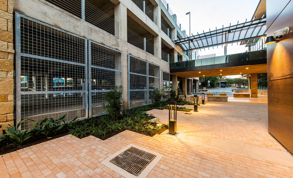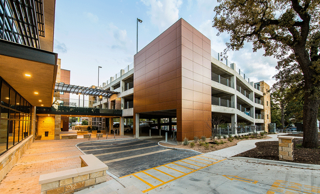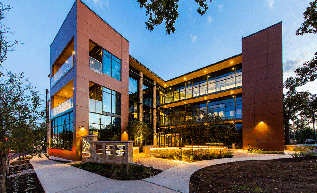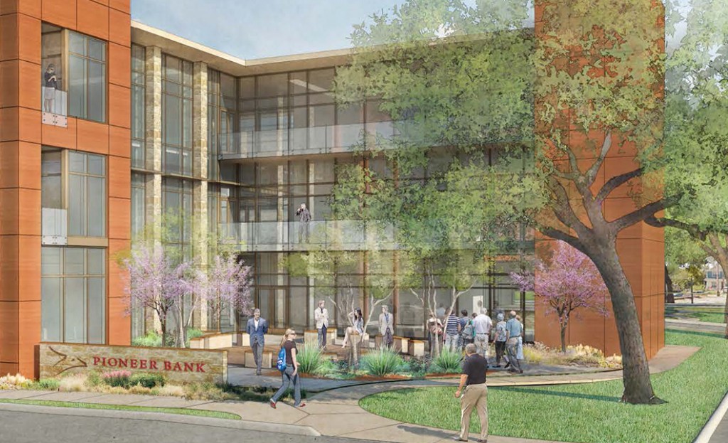 RVi is providing landscape architecture services for Pioneer Bank’s new bank building in the Austin-University area. Site design includes an grand entry plaza at 38th Street which provides a unique front door to the building and serves as a shaded gathering space for employee use and special events. An interior courtyard provides street-level access as well as covered access from the adjacent 4-level parking structure to the bank. Within the courtyard, an intricate hardscape design extends into the entry drive to evoke a more pedestrian oriented space, even where vehicles are present.