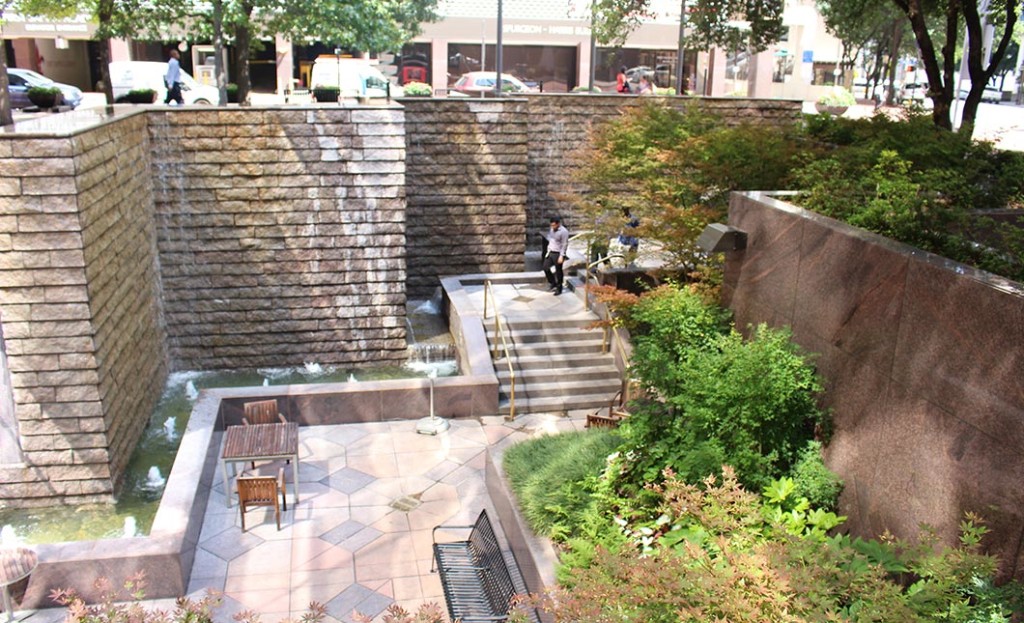 An octagonal granite paving pattern leads visitors to a custom-designed water feature located on the edge of pedestrian stairs that lead to the building’s lower level. Water cascades off all edges of the granite, over shingled wall surfaces, and following the steps down a corbel faced runnel. This delightfully cool water feature is a popular gathering spot for downtown workers, particularly during warm summer days.