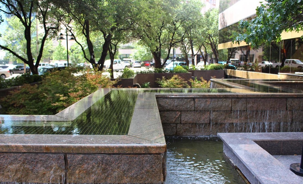 An octagonal granite paving pattern leads visitors to a custom-designed water feature located on the edge of pedestrian stairs that lead to the building’s lower level. Water cascades off all edges of the granite, over shingled wall surfaces, and following the steps down a corbel faced runnel. This delightfully cool water feature is a popular gathering spot for downtown workers, particularly during warm summer days.