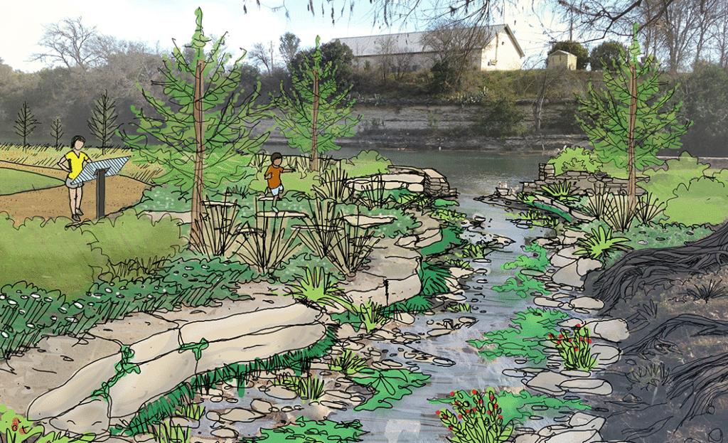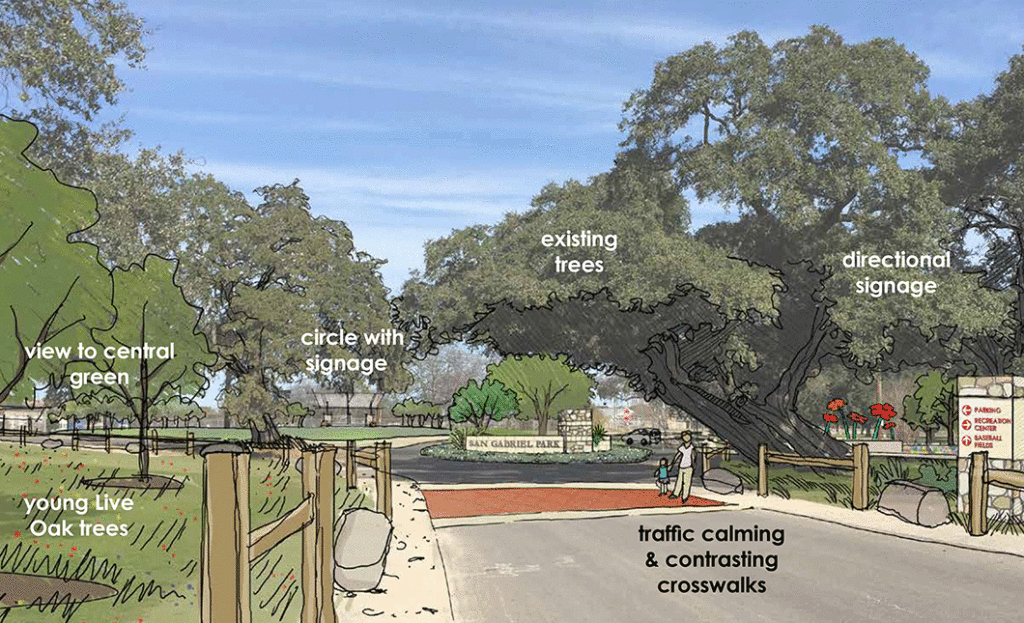 The design of San Gabriel Park has included the restoration of three springs and the re-creation of a habitat for potentially endangered species. The 100- acre park has a rich history of more than one hundred years and serves as the central park of Georgetown. The park is located at the confluence of the forks on the San Gabriel River and features flexible open space for events, concerts, and farmers’ markets.