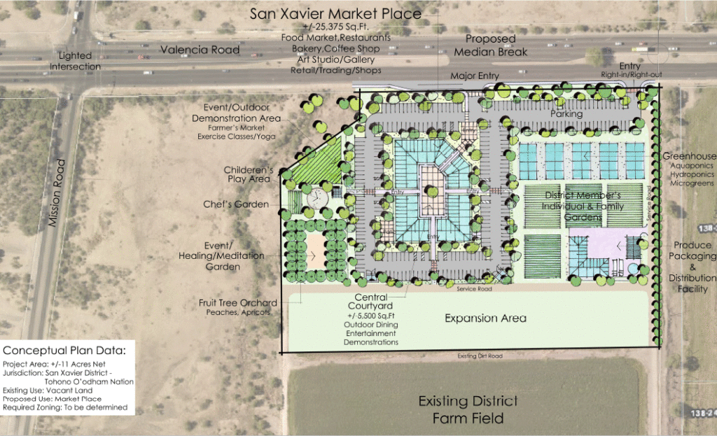 The San Xavier Market Place is a commercial development center for both Native and Non-Native American businesses located on the Tohono O’Odham Nation, San Xavier District. The Market Place will be managed by the Tribe, and will showcase the history of the area through artist space and galleries, cultural demonstrations, as well as retail and trading shops. Serving as an entertainment destination, the Market Place will provide further retail opportunities, restaurants, and markets, a commercial kitchen, produce packaging and distribution facility, and feature community gardens for District members.