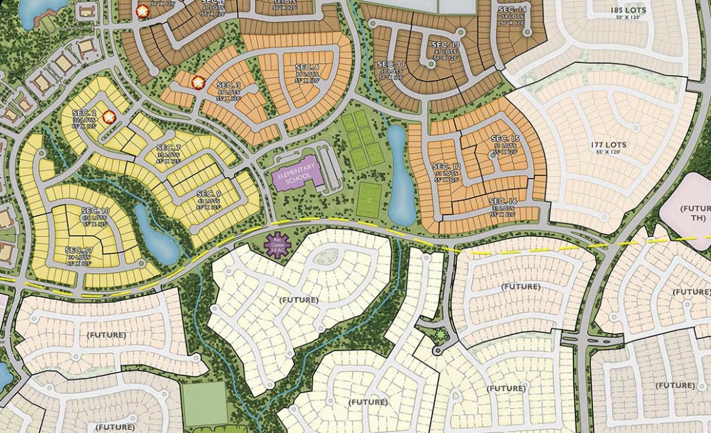 RVi was able to preserve over 130 acres of existing forest, and special consideration was given to creating open space corridors throughout the community to promote connectivity & quality of life. Tavola is also bordered by two waterways in Peach Creek to the east and Caney Creek to the west. The community also includes numerous pocket parks, community soccer fields, and amenity lakes.