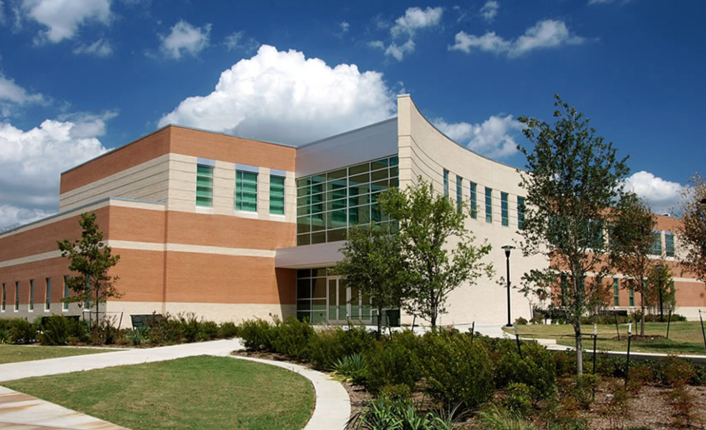Near the building entrances, outdoor seating areas with plantings of native shrubs and perennials provide a shaded and colorful respite for visitors and students. Other site improvements include design of a cost-efficient and reliable sub-drain system for the practice fields and a large phase-one detention pond with sensitive grading and native grass plantings that creates an undulating, more natural bank edge.