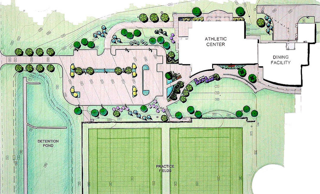 The plaza north of the building will provide direct and ceremonial access to the football stadium. Initial plantings of large shade trees and plantings master planned as a part of the future stadium construction will provide a framed view to and from the stadium seating. South side entry plazas serve as the primary entrance for visitors. The student green, with its sweeping seat wall, ties directly to the residence hall pedestrian areas planned for construction adjacent to the dining hall. Ornamental fencing with masonry columns frame the stage and view of the fields from the building and amphitheater.